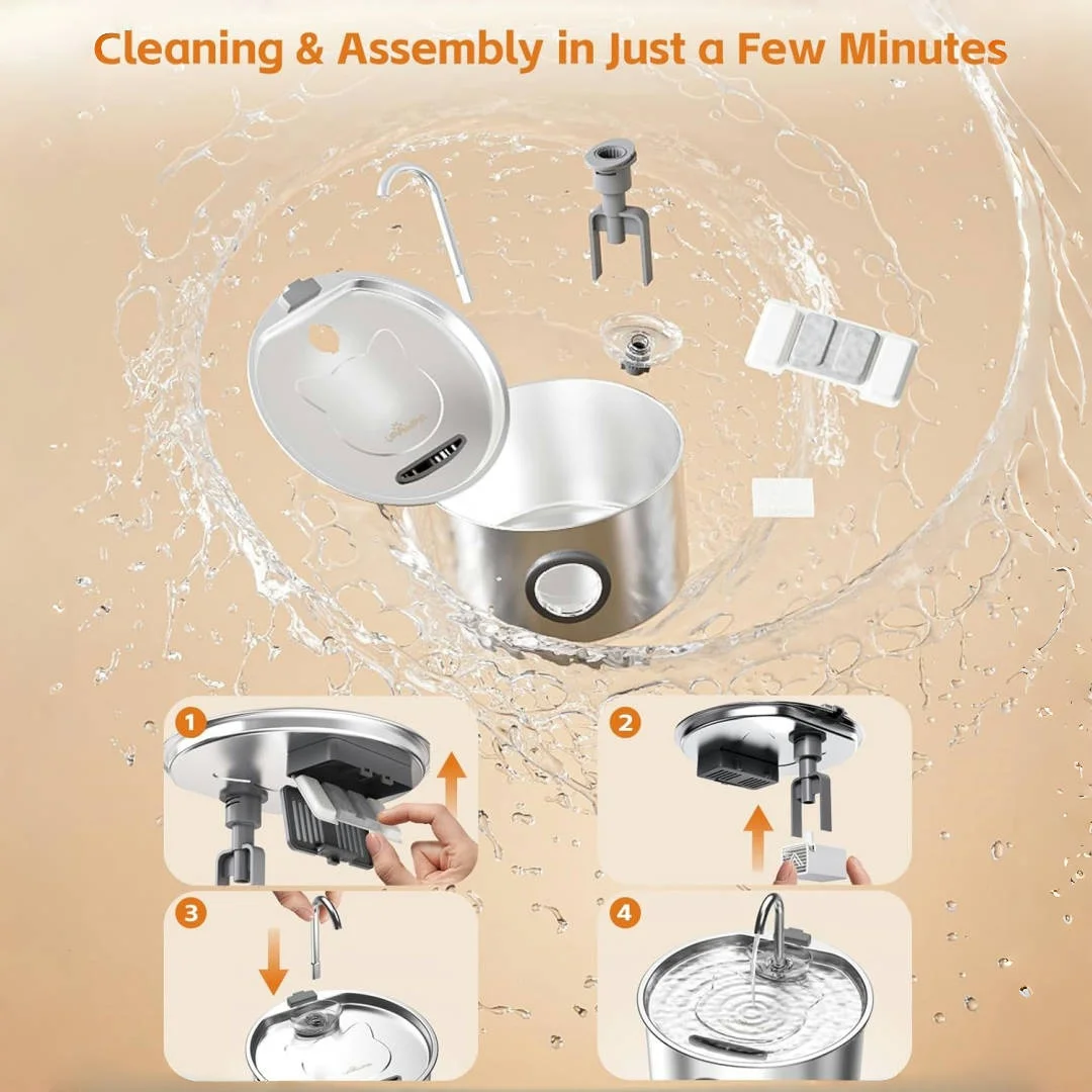 Keep your cats hydrated with a quiet, stainless steel fountain that delivers fresh, flowing water all day.